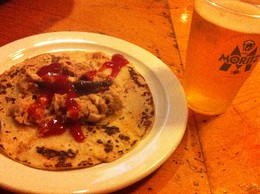Antes de começar o jogo o Terreta vai enchendo, rapazes, raparigas, velhos, novos, engravatados ou em calções e geralmente de camisola com emblema do Barça. Quase todos de pé cantam o hino do Barça segundos antes de começar a partida. O anfitrião Miguel é dos mais empenhados e ainda tem tempo para aconselhar uma tapa valenciana, uma espécie de crepe aberto com recheio de atum e anchovas para acompanhar a cerveja de marca desconhecida por mim, Moritz. Divimos o crepe cortando com garfo e faca e no fim percebemos que aquilo era para enrolar e comer à mão. Da próxima já sabemos como é. Apostámos 2€ num 1-2 para o Barça que nos podia ter dado 70€ de prémio num totobola caseiro. Falhámos por 1...
