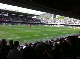 Foi chegar guardar as malas e correr para ... Camp Nou. Não para ver o campo principal mas sim para ir ao Mini Estádio, o recinto onde joga o Barcelona B que no meu dia de anos jogava ao meio dia com o Betis de Sevilha empenhado no regresso à liga principal espanhola. Mesmo em passo de corrida só consegui chegar ao campo já na 2ª parte e deparei-me com uma lotação esgotada! E digo-vos que o Mini Estádio do Barça é bem melhor que alguns dos recintos das nossas ligas profissionais. A minha mulher confirmou que este campo ganha de goleada ao estádio do Trofense onde ela viu o Benfica de Quique.