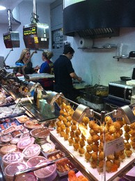 Não , não fui a Madrid ver o duelo para a Champions. Segui a sugestão do amigo Tiago que me marcou dois lugares ao balcão do La Terreta que é de um amigo dele independentista de Valência, tal como seu pai, e que já viveu em Portugal durante quatro anos. O grande Miguel recebeu-me, e à minha mulher, de braços abertos e apesar do enorme nervosismo à volta do jogão foi sempre dando notas interessantes acerca do local e dos clientes.
