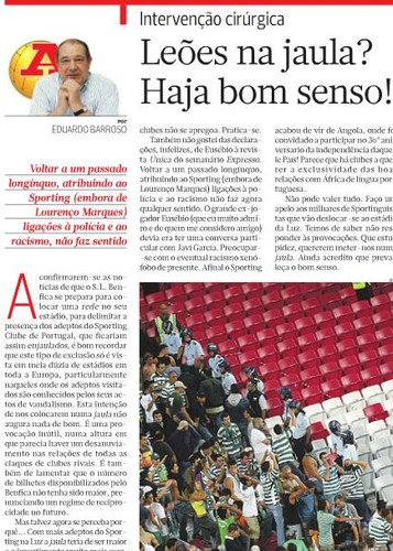 Também não gostei das declarações, infelizes, de Eusébio à revista Única, do Expresso [Sobre declarações infelizes és um expert, oiçamos-te com atenção]. Voltar a um passado longínquo, atribuindo ao Sporting (embora de Lourenço Marques) ligações à polícia e ao racismo, não faz agora qualquer sentido [O que lá vai, lá vai, sobretudo se não for conveniente]. O grande ex-jogador Eusébio (que eu muito admiro e de quem me considero amigo) devia era ter uma conversa particular com Javi García [E tu devias ter uma conversa particular com, por exemplo, o Balboa ou oZoro]. Preocupar-se com o eventual racismo xenófobo presente [Conceito engraçado, este do racismo xenófobo. Se for contra pessoas da mesma nacionalidade, o racismo já não merece preocupação?]. Afinal o Sporting acabou de vir de Angola, onde foi convidado a participar no 36.º aniversário da independência daquele país! [Não estou a ver a relação… Isto vem a propósito de quê mesmo?] Parece que há clubes a querer a exclusividade das boas relações com África de língua portuguesa [Foi justamente o que pensei quando introduziste a martelo o convite para levar 4 na pá neocolonialista].