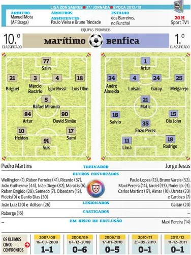A tudo isto o Benfica respondeu com uma entrada confiante nos Barreiros, Lima sofre falta limpinha dentro da área madeirense e vai cobrar o respectivo penalti. Entrada de sonho, era isto que queríamos. O recuo no terreno e a passividade com que se encarou o resto da primeira parte é que não estava no programa. A equipa não resistiu à tentação de abdicar da iniciativa do jogo e encolheu-se a defender a vantagem minima. Felizmente que o golo do Marítimo apareceu antes do intervalo, se o jogo continuasse assim até aos 80' podia ter acontecido o empate bem perto do fim sem tempo para reacções.