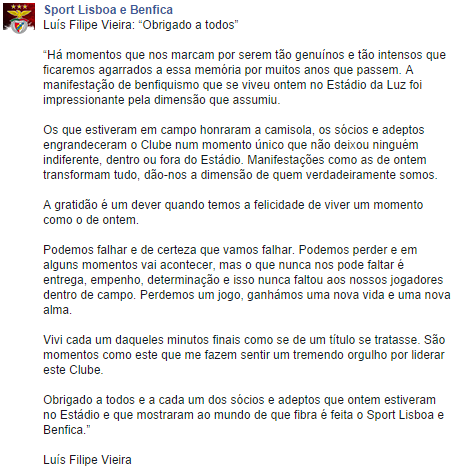 Faltam cinco jogos, acredito que tudo pode acontecer mas, acima de tudo, acredito muito que começámos pela pior parte e que não se voltará a repetir uma noite destas na Luz. Parabéns ao Zenit que tem ali uma bela equipa.