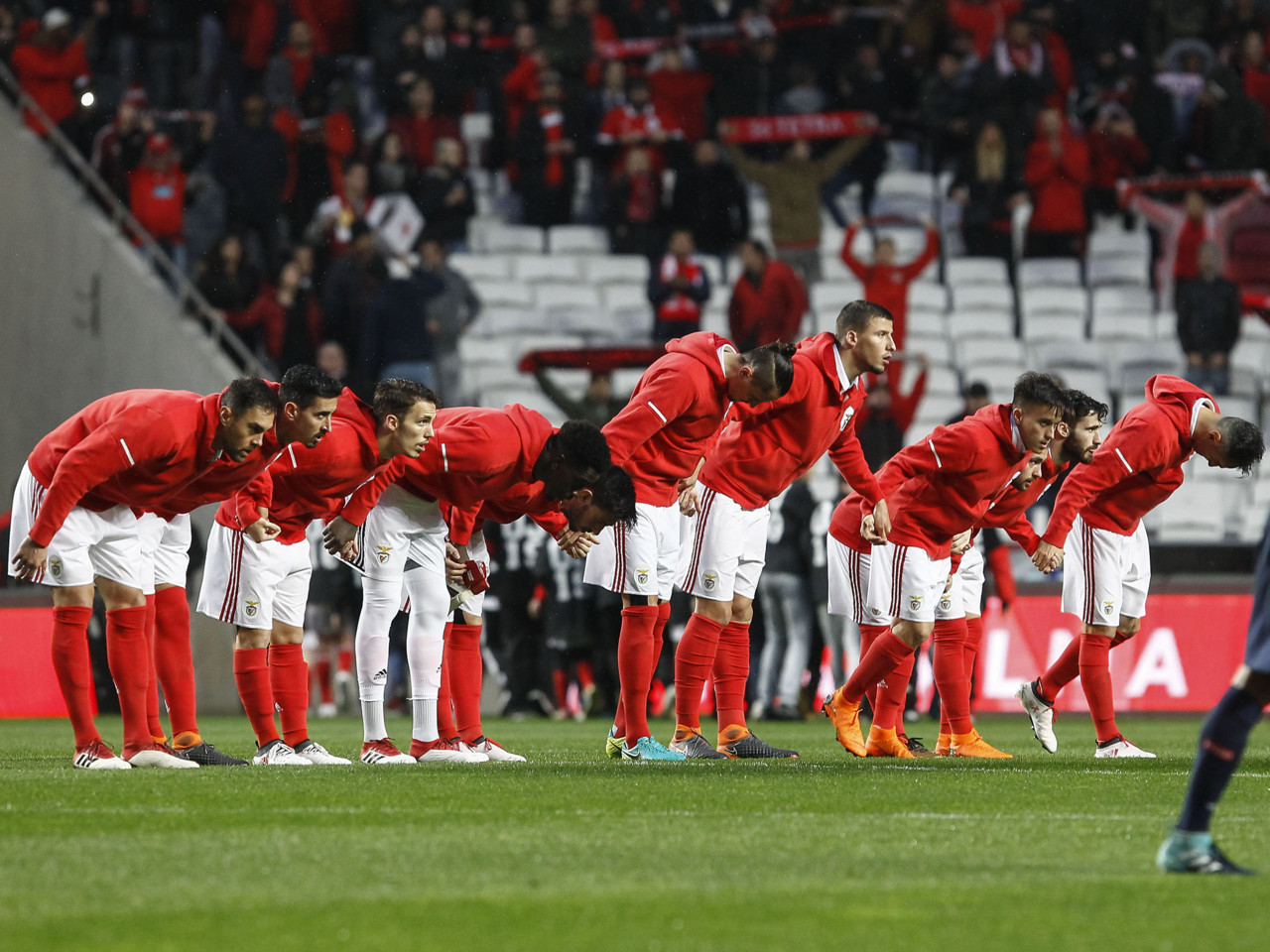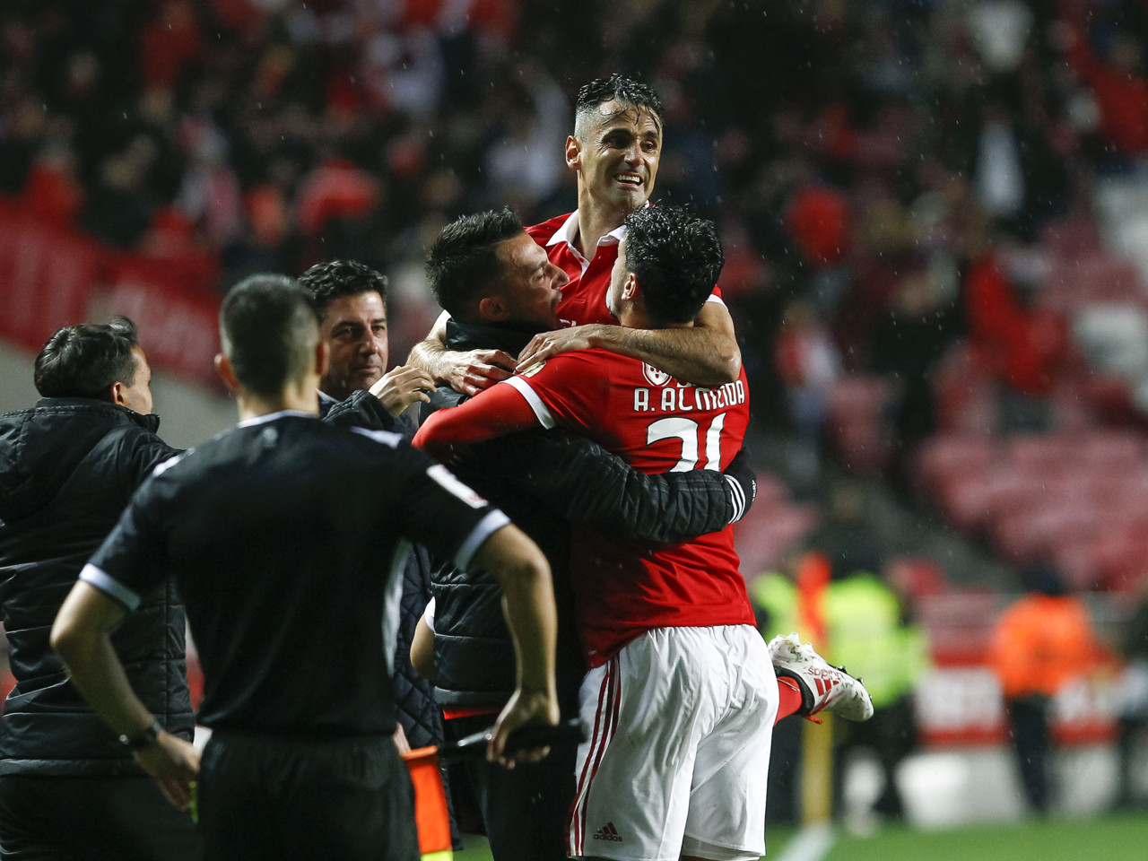 Queria destacar o festejo do Jonas à espera do André Almeida de joelhos para lhe massajar o pé. O André não deixou, chegou ao pé do "10" e levantou-o para o abraçar, ali na nossa frente. Isto é o André Almeida. À Benfica. Também gostei do festejo com um circulo de jogadores sentados e Grimaldo a distribuir jogo. Estas exibições só trazem vantagens, animam quem joga, descansam quem vê e até permite que aquela malta que paga bilhetes e Red Passes só até aos 80 minutos possa sair do estádio ainda mais cedo. A tribo que vai à bola em sofrimento, que mal começa o jogo e começa a pensar a que minuto é que foge dali.Esteja 5-0 ou 1-0. É igual.