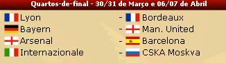 Liga dos Campeões: 1/4 Final J.G. 19.03.10 Meias-finaisBayern/Manchester United-Lyon/Bordéus Inter/CSKA-Arsenal-BarcelonaTags:internacional link do post favorito Mais para ler