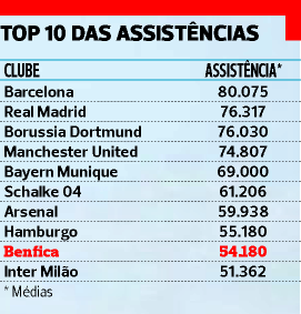 Estudo de 'site' alemão coloca Benfica com média de assistências entre os dez mais europeus Total de 547 mil adeptos só na Liga Barcelona lidera com 80 mil pessoas em média/jogo: