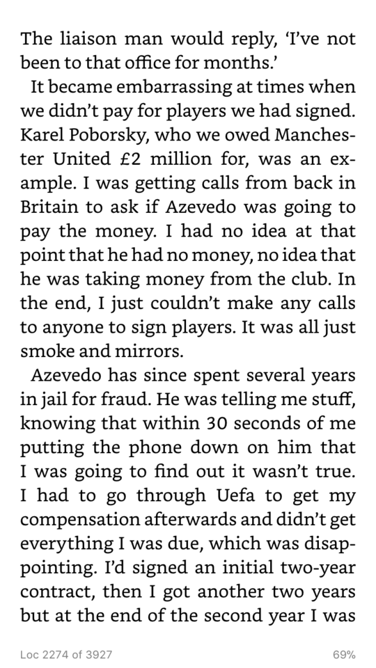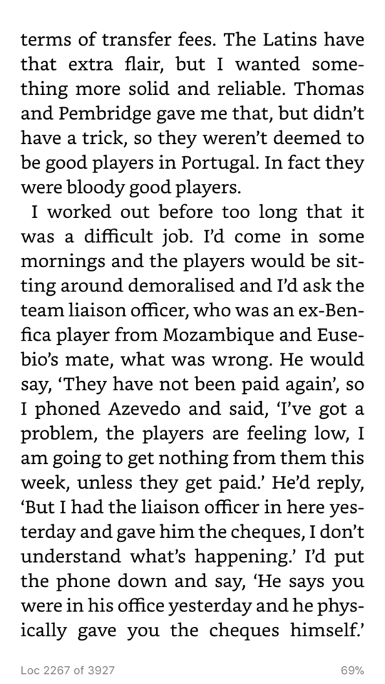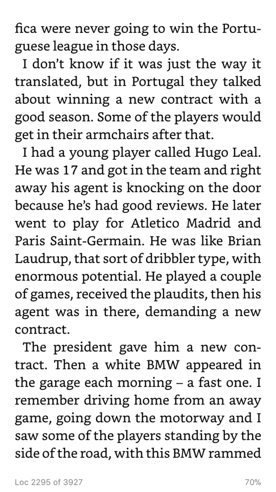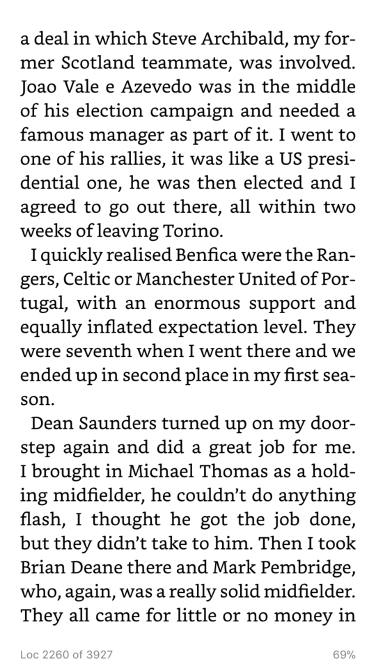Acaba de ser editada a biografia de Graeme Souness. Um livro bem interessante e com uma passagem dedicada à sua estadia no Benfica de... Vale e Azevedo. Partilho aqui as páginas em que o treinador fala das mentiras do presidente, explica como era impossível o Benfica ganhar o título ao Porto por causa do sistema de arbitragens, conta como o Benfica falhou a contratação de Nistelrooy, esse mesmo, e ainda fala de Hugo Leal.