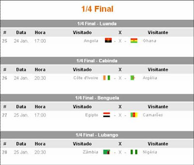 Ontem mais dois jogos, não foram 3 porque confirmou-se a saída do Togo da competição, e mais duas belas surpresas. A Argélia, com Yebda e Halliche, não confirmou a boa forma mostrada contra o Egipto a quem roubou a vaga no próximo Mundial. Foi uma decepção ver os argelinos serem completamente dominados por um surpreendente Malawi que ganhou fácil por 3-0!
