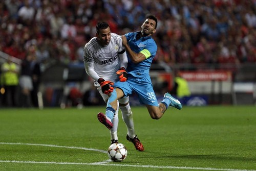 Com o Zenit a apostar tudo para igualar a eliminatória, o Benfica ia mostrando solidez defensiva e sofria pouco apesar de ter menos bola. Quando tudo parecia controlado acontece um impensável atropelamento de Zhirkov a Nelson que deixa o defesa do Benfica fora da jogada. Sai cruzamento fácil e golo de Hulk.